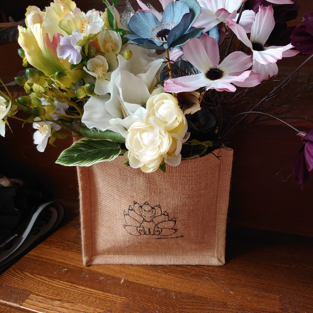もう1つは花材入れにして、手前の持ち手は中側に折り込んで奥側の持ち手を壁のフックにかけております。